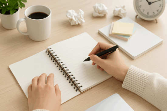 → 例:「新しい副業の情報を見つけた」「SNSで反応が増えた」。 - 書いたら 「これでいい」 と声に出し、認識を固定する。