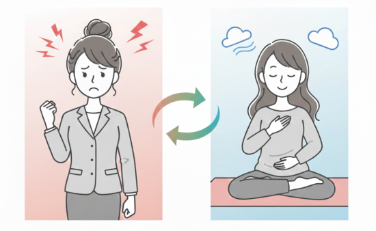 子どもの送り迎えの後に、玄関で一度立ち止まってゆっくり息を吐くだけでも気持ちが切り替わりやすくなりますし、パソコン作業の前に背筋を伸ばして軽く深呼吸すると集中しやすい状態が作れます。