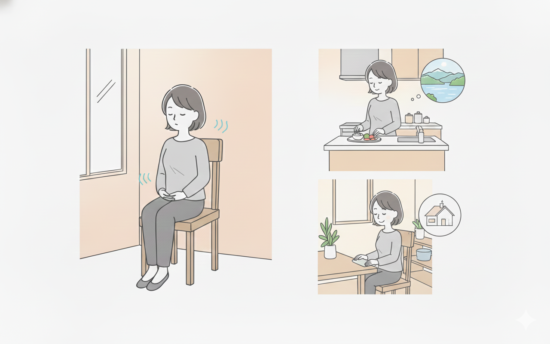 例えば、夕方の家事で疲れを感じたときに椅子へ座り、30秒だけ深く呼吸してみるだけでも肩の強張りが落ち着いてくることがあります。